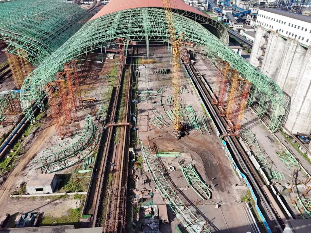 童軼翾介紹說,工程建設過程極具挑戰性。B4棚項目地處B1棚、B2棚及煤倉之間,場地狹窄,無法現場制作鋼結構。施工團隊將每垮鋼屋架在加工廠精心制作成11段,再用平板車運至現場,由工人拼接成3部分。安裝時,在屋架下方搭建30多米高的支撐架,先將屋架兩端柱腳部分吊裝就位,再進行中間部分的吊裝,施工難度極大。